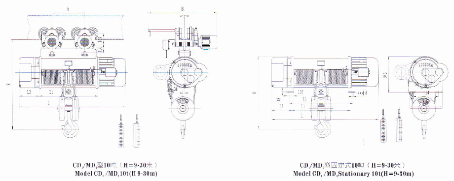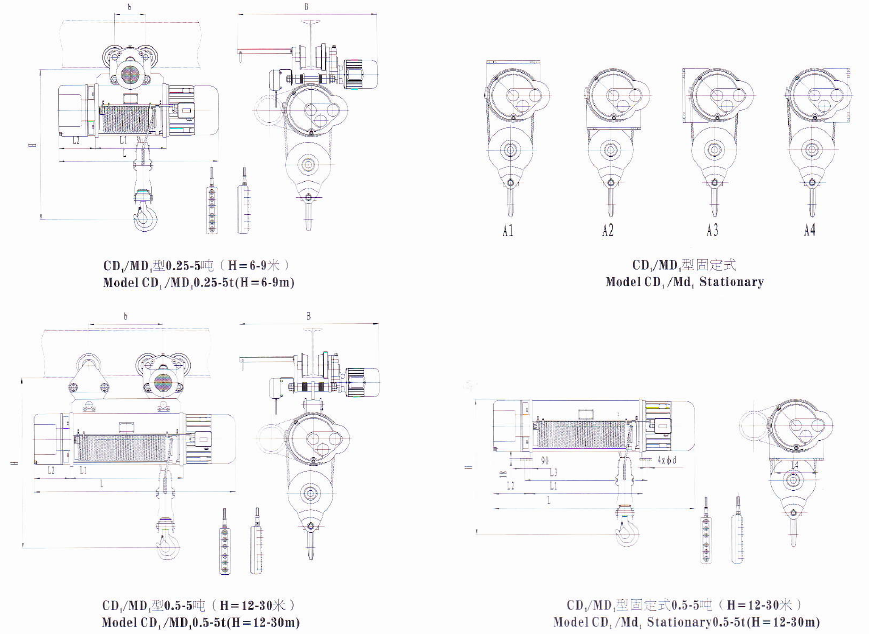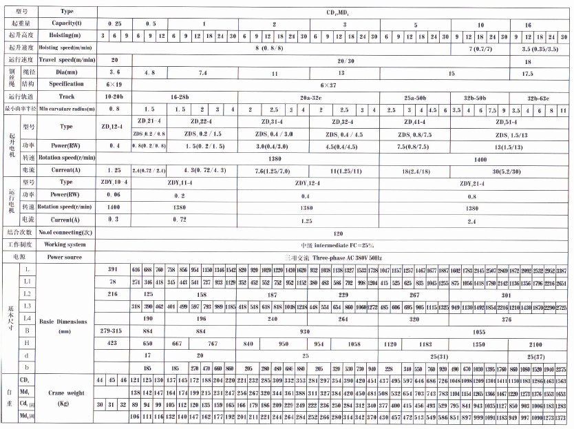 CD1型,MD1型鋼絲繩電動葫蘆是一種輕小型起重設備,它可以安裝在葫蘆單梁、橋式起重機、門式起重 機、懸臂起重機上。稍加改動,還可作卷揚用。因此,它是工廠、礦山、港口、倉庫、貨場、商店等常用的 起重設備之一,是提高勞動效率,改善勞動條件的必備機械。 CD1型電動葫蘆的起升速度為常速,可以滿足一般使用要求:MDI型電動葫蘆具有兩種起升速度-ˉ常速和慢速。慢速工作時,可以滿足精密裝卸,砂箱合模,機床檢修等精細作業的要求,所以,MDl型電動葫蘆的 適用范圍比CDl型電動葫蘆更為廣泛。