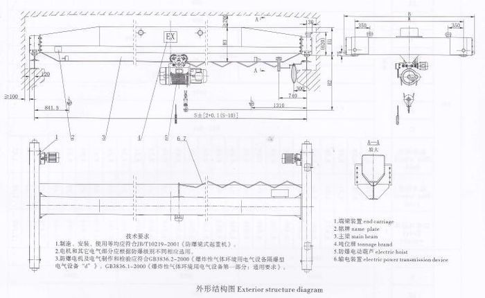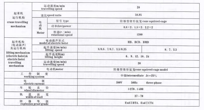 本起重機適用于工廠內具有防爆級別不高于B級或C級,引燃溫度組別不低于T4(135℃ )組的可燃性氣體、蒸汽與空氣形成的爆炸性氣體環境中,所適用的危險區域為1區或⒉區,不適用于0區。